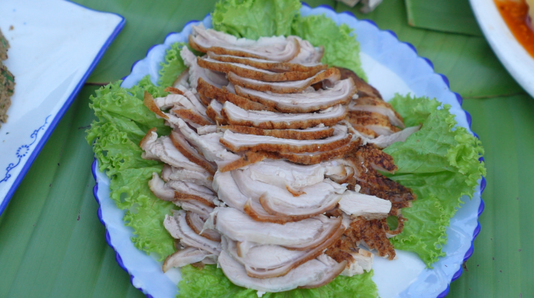 德宏盈江火烧猪,是云南省德宏傣族景颇族自治州盈江县的一道传统美食。上好的火烧猪一般选用本地小耳猪,去毛和内脏后,将洗净的番石榴叶、芭蕉叶、草果叶等辅料中的一种或多种塞进猪的腹腔内,再用竹篾缝合,然后用文火对猪身轮番烘烤。经过3小时左右的烘烤,掏去腹腔中填充的辅料,刮去表面的焦糊处,清水洗净、切成薄片,就着折耳根、芫荽、小米辣等做成的蘸水蘸食之,辣中带着酸、酸中带着香、香中带着脆,那滋味别提有多爽!