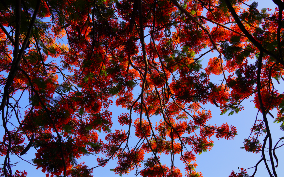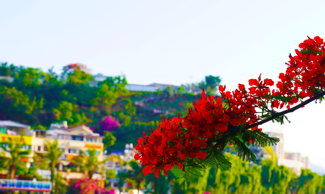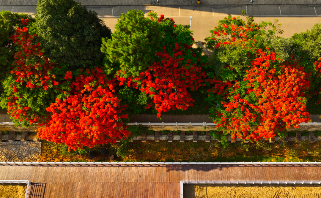 盛夏之时,凤凰花陆续绽放。在临沧市云县,一树又一树的凤凰花,沿着河岸蔓延,像一只只“火凤凰”停歇在树枝上,或向天空伸展,或向路边延伸,尽情展示生命的灿烂。