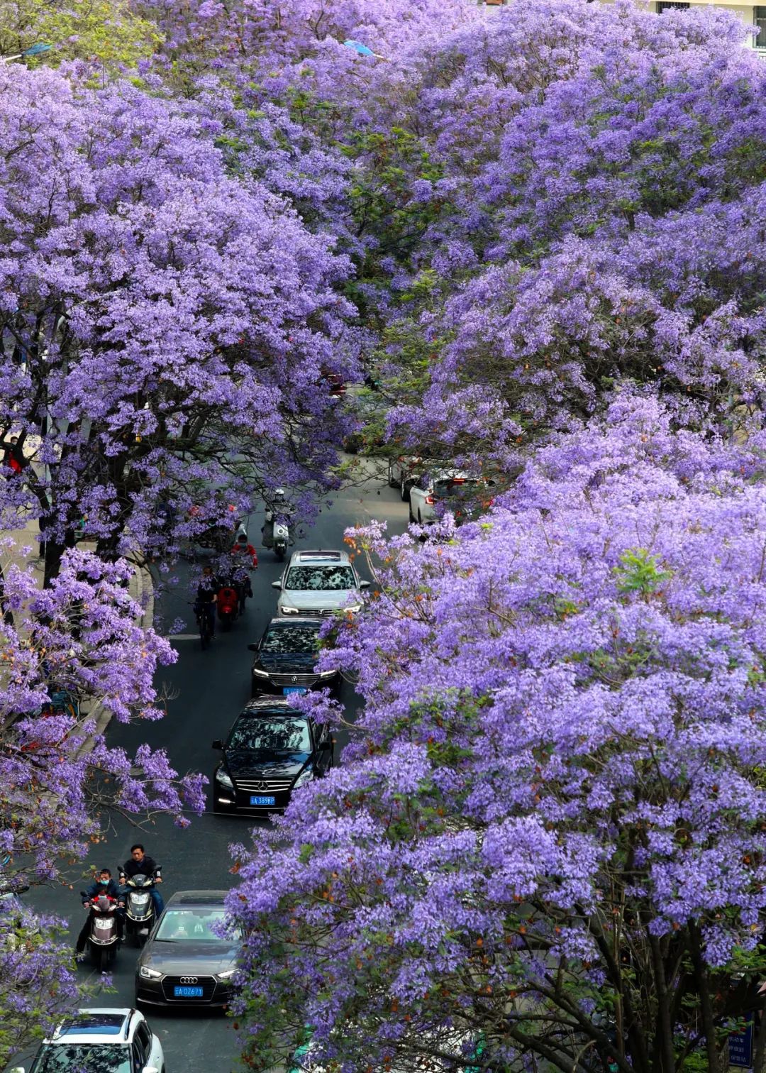 每逢春末夏初,昆明市教场中路、春城路、盘龙江边等多个地方蓝花楹盛放,蓝紫色将这个城市装点得如梦如幻。蓝花楹,正在成为云南文旅的又一个“浪漫IP”。倘若“五一”假期来云南,定要留出片刻与这“人间仙子”相伴,看一世繁华、品一生浪漫。