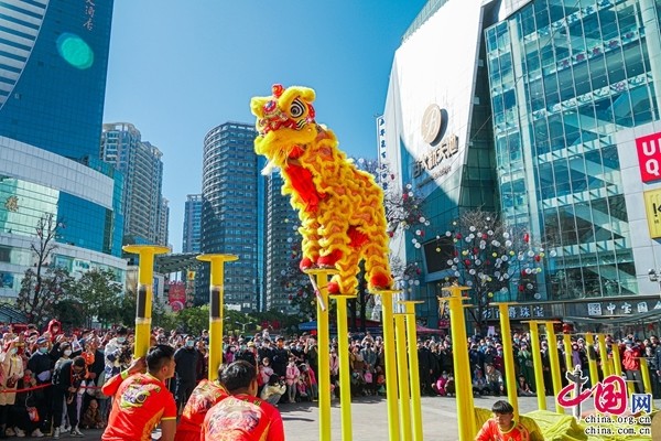 人群熙攘的大年初一下午南屏街很是热闹,锣鼓齐鸣,龙狮舞动,舞出了新年的精气神。“很久没有看到过这么震撼的龙狮表演了,这才是过年该有的氛围。”现场观众连连拍手叫好。开年舞龙狮是中华民族的传统年俗,喜庆的龙狮表演不仅很耐看,还是祥瑞的象征。“大鼓咚咚咚,响锣锵锵锵”。随着激越的鼓声,舞龙舞狮连番登场。主舞台上,舞龙演员们使出了穿、腾、跃、翻,滚、戏、缠等舞龙绝技,灵动地展现了龙的神韵。而在广场上,金狮在2米多高的梅花桩上舞动,时而高高跃起,时而翻滚扑地,或喜怒动静,或勇猛威严,将中华雄狮的风采展现得惟妙惟肖。台上台下龙狮呼应,互相逗趣,吸引众多游客驻足观看。