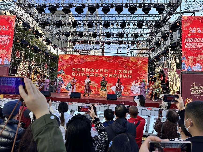 2023年1月22日上午10点,游客陆续聚集到南屏街广场舞台边。随着“新年好”的音乐响起,开道兵、财神、福、禄、寿、喜神、嫦娥和生肖兔、金吒、木吒、哪吒等神话人物纷纷在舞台上亮相,台下观众纷纷掏出手机,记录大年初一这热闹的一刻。