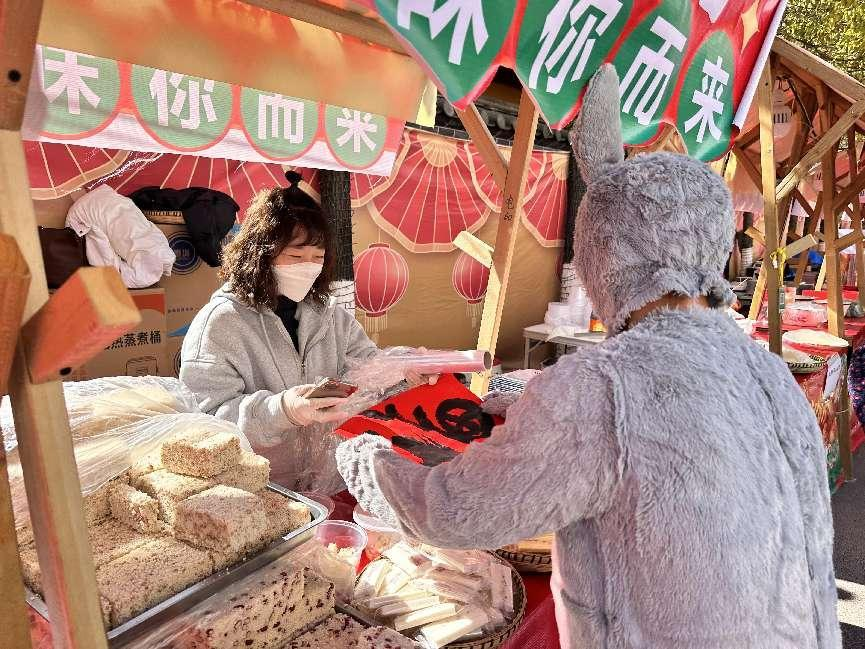 给仓园街年味街开街仪式中增加了浓浓的喜庆感,兔生肖给商家送去“福气”。