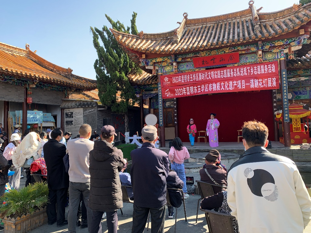 为认真贯彻落实党的二十大精神,进一步弘扬优秀民族民间传统文化,丰富和活跃昆明群众文化生活,营造欢乐、祥和、文明的节日气氛,继南屏步行街五华区广场舞选拔赛之后,由五华区文化和旅游局主办、五华区文化馆承办的“2023年昆明市五华区非物质文化遗产项目-滇剧花灯展演”于元月十九日、二十日在翠湖莲花禅院精彩上演。