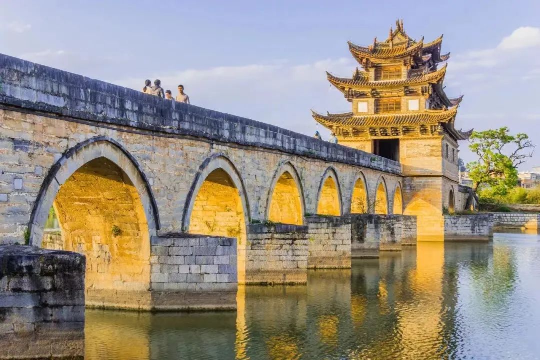 双龙桥,俗称“十七孔桥”,横跨泸江与塌冲河交汇之水面上,是座三阁十七孔大石拱桥,双龙桥是云南省著名古迹之一,被认为是云南省规模最大、艺术价值最高的一座多孔连拱桥,并已列入中国造桥史册。