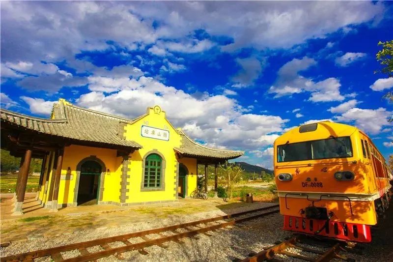 一列怀旧的米轨小火车,带着我们穿越城市,回归乡野。一路上稻香四溢,百花丛生。虽不比现代化的火车高铁一样能日行千里,但对于来建水旅游观光的人来说,刚刚好,从临安站出发,途径双龙桥站、乡会桥站,抵达团山站。