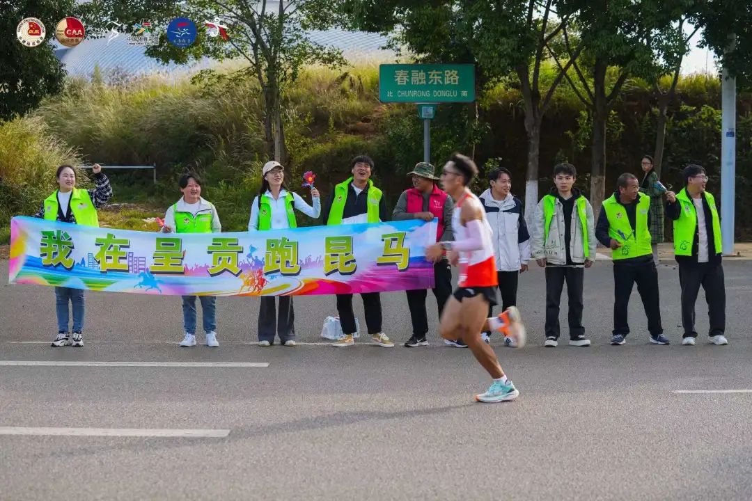 赛道沿途,呈贡区精心组织了欢乐锅庄舞、花灯等非遗文艺表演以及大学生啦啦操表演,他们展现着昆明人民的热情好客,为跑者们加油助威的同时,让更多人得以沉浸式感受昆明的特色文化。