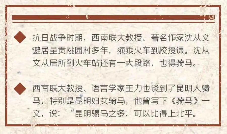 西南联大教授、语言学家王力也谈到了昆明人骑马,特别是昆明妇女骑马,他曾写下《骑马》一文,说:“昆明骡马之多,可以比得上北平。乡下女子也会横坐在载货的鞍子上,让马蹄嘚嘚的声音伴她们的歌声,这却是北平女子所不能及的。”