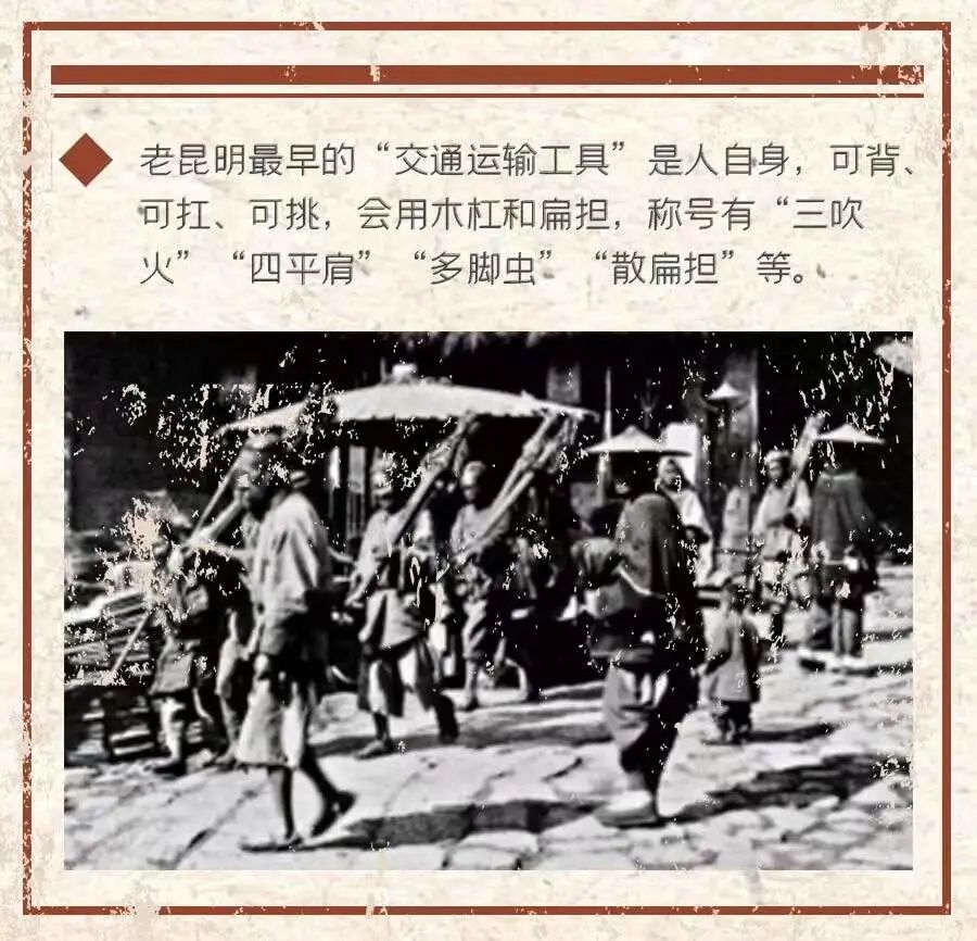 老昆明最早的“交通运输工具”是人自身,可背、可扛、可挑,会用木杠和扁担,称号有“三吹火”“四平肩”“多脚虫”“散扁担”等。在“人力交通供给侧”难及和不便之处,老昆明人也可以自骑,外租或自备。马是最原始的非人力交通工具,直到现代,仍然是“交通供给”的重要选顶。
