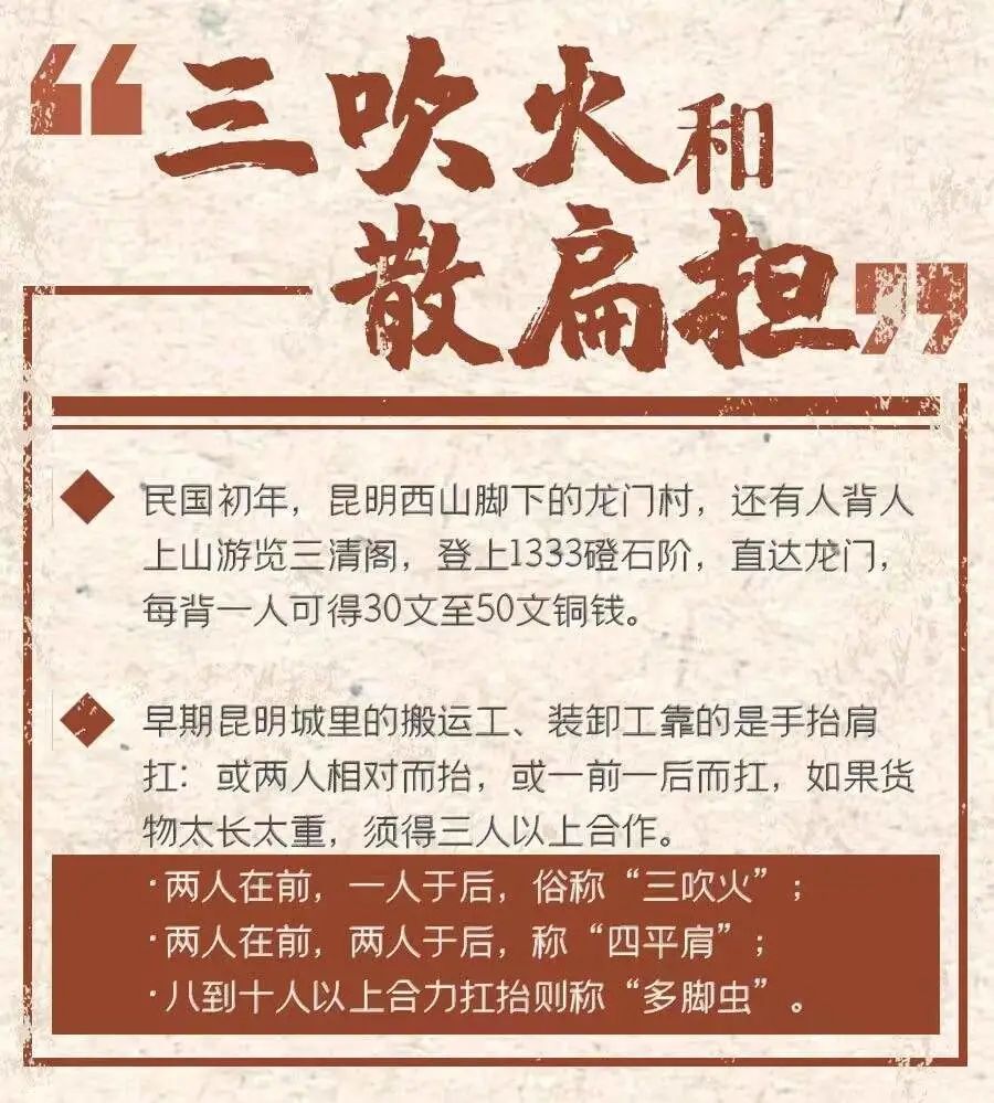 早期昆明城里的搬运工、装卸工靠的是手抬肩扛:或两人相对而抬,或一前一后而扛,如果货物太长太重,须得三人以上合作,两人在前,一人于后,俗称“三吹火”;两人在前,两人于后,称“四平肩”;八到十人以上合力扛抬则称“多脚虫”。即便后来有了汽车、火车,一装一卸,还得靠这“三吹火”“四平肩”和“多脚虫”。