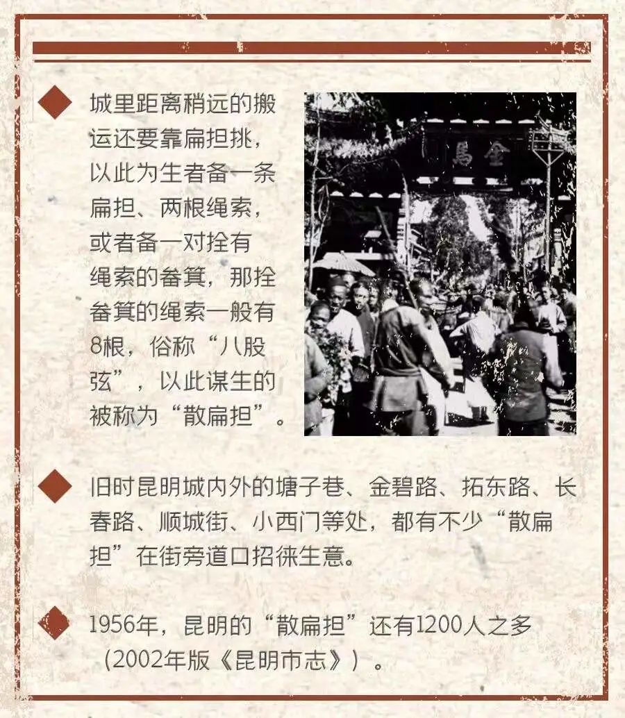 城里距离稍远的搬运还要靠扁担挑,以此为生者备一条扁担、两根绳索,或者备一对拴有绳索的畚箕,就可以上街谋生了。那拴畚箕的绳索一般有8根,俗称“八股弦”,以此谋生的被称为“散扁担”。他们收入很低,还常常揽不到活计,平时只好到饭摊上买烧饼或以馆子的剩菜剩饭充饥,晚上大多无家可归,只能花一两角钱住到鸡毛店里。旧时昆明城内外的塘子巷、金碧路、拓东路、长春路、顺城街、小西门等处,都有不少“散扁担”在街旁道口招徕生意。用得着他们的时候,在街头喊一声“扁担”,他们就会聚拢过来,为雇主挑运行李物品等。由于报酬微薄,“散扁担”们不得不早出晚归,辛苦劳作。直到1956年,昆明的“散扁担”还有1200人之多(2002年版《昆明市志》)。
