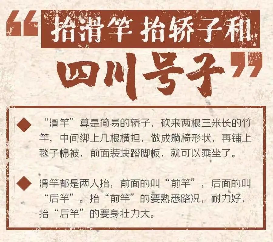 抬滑竿有“号子”,抬轿子也有“号子”。1931年,美国作家斯诺来到云南,和探险家洛克结伴从昆明西行大理,路上洛克得了疟疾,不得不雇来轿子,那轿子“用竹子和藤条编成,固定在四根竹竿做的轿杠上,座位设在中央,上面盖着一块油布,轿夫一前一后,各抬两个轿杠。在中国没有公路的地方,轿子可算是旅客们最舒适的交通工具了”。斯诺也发现,“抬轿子成了四川人独占的行业。洛克雇了四个轿夫,分两组轮换着抬。他们裸露的肩膀上都长了一英寸厚的老茧。他们唯一的私人财产就是拴在布腰带上的烟枪。晚上,他们除了吃黏性很大的米饭外,很少吃别的东西,一吃完饭,他们就抽鸦片,晕乎乎地进入梦乡。然而他们体力惊人,抬轿子的姿态优美,可以颤悠颤悠地连抬几个钟头而不知疲倦。”