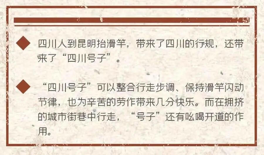 四川人到昆明抬滑竿,带来了四川的行规,还带来了“四川号子”。抬滑竿不易,除了体力,还要有技巧,如脚动身不动,腰杆似箭直,换肩不停步等。最重要的是前后两人要通力配合,协调一致,“踩到点子上”。否则不但费力,还可能“翻竿”出事。于是“四川号子”在这里派上了用场,不但可以整合行走步调、保持滑竿闪动节律,也为辛苦的劳作带来几分快乐。而在拥挤的城市街巷中行走,“号子”还有吆喝开道的作用。