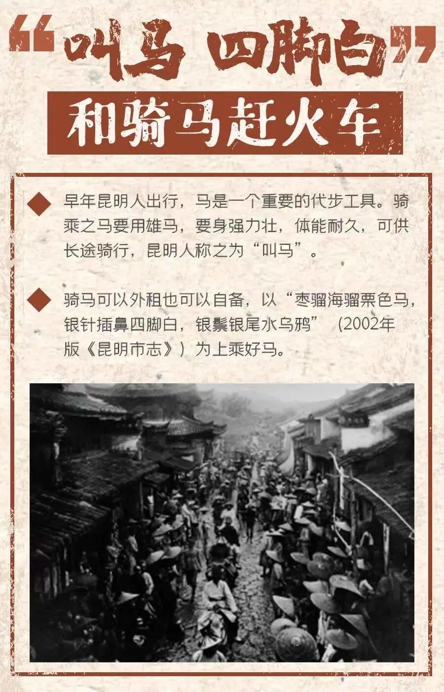 早年昆明人出行,马是一个重要的代步工具。骑乘之马要用雄马,要身强力壮,体能耐久,可供长途骑行,昆明人称之为“叫马”。骑马可以外租也可以自备,以“枣骝海骝栗色马,银针插鼻四脚白,银鬃银尾水乌鸦”(2002年版《昆明市志》)为上乘好马。