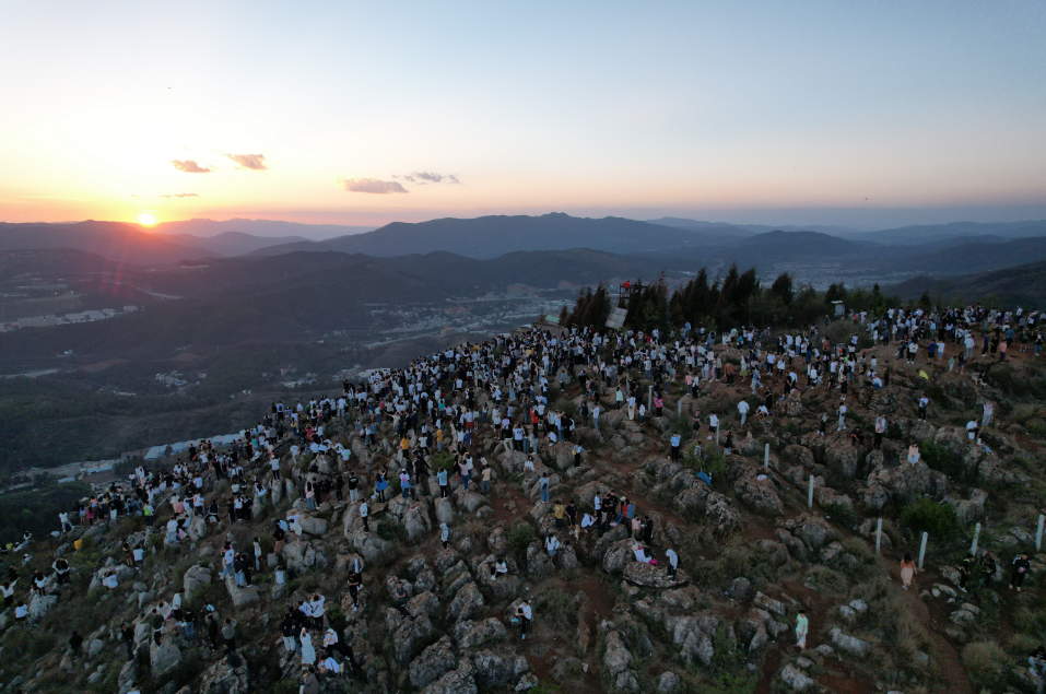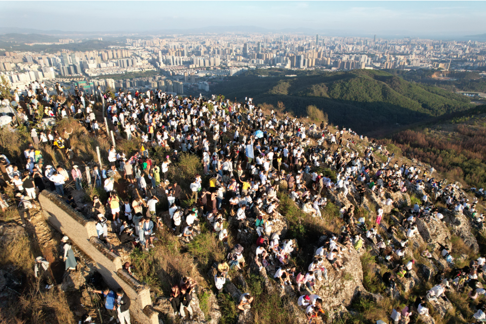 6月17日一大早,人们就开始涌向山顶,一辆辆车排成长龙,山下开始堵车。车辆缓慢前行,最终停在山间,游客必须步行前往山顶。