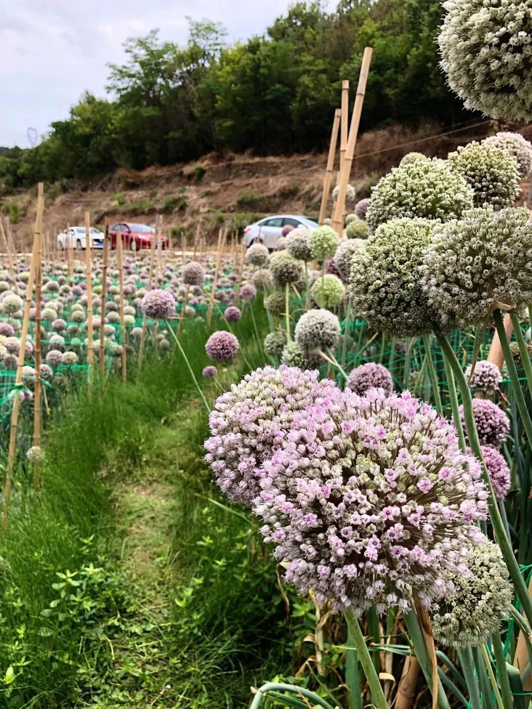 成片的韭葱花球很多人是第一次见,有人说它圆乎乎的,有点像米花糖,看着就想咬一口,但踩过点的人说,花儿很漂亮,就是有点蒜香味。梦幻的颜色、独特的造型,吸引着各方游客纷至沓来,“距离近”“路好走”“值得来”成为游客们前来打卡的理由。