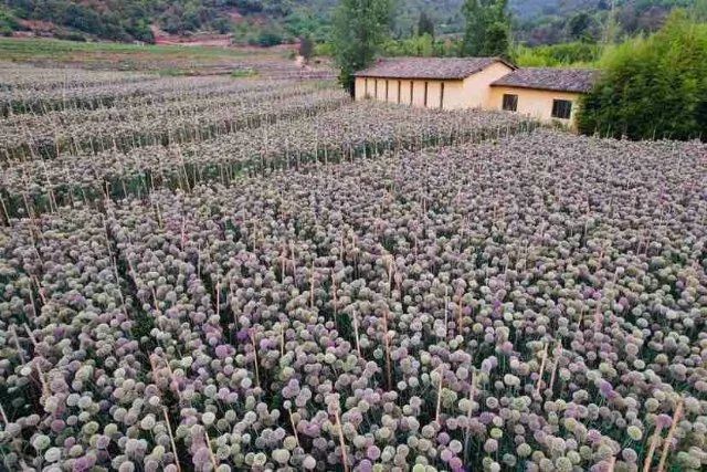 其实,这里是五华区西翥街道瓦恭社区禹都甸小组种子繁殖基地。而网友口中的“大蒜花”“蒜球花”学名“韭葱花”,也被称为“西洋蒜”“海蒜”,花球直径约10厘米,开花前可食用,味轻鲜甜,受到广东、深圳等地食客的喜爱。据了解,目前种植于西翥瓦恭的韭葱主要以种子繁殖为主,今年韭葱种植面积约100亩,于1月春节前播种,5月中旬达到盛花期,花期预计至6月底,7月将进行种子的采收。