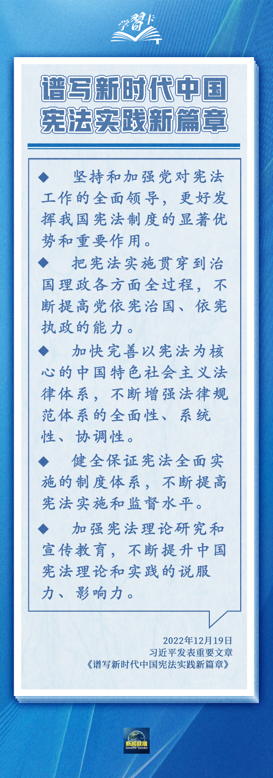 on 周二, 12/05/2023 - 09:17 作者 编辑:朱裕玲 文字校对:田春玲 徐敏 初审:刘伟 终审:周赤东 2023年12月4日,是第十个国家宪法日。宪法与国家前途、人民命运息息相关。围绕依宪治国、依宪执政,习近平总书记多次在不同场合强调,宪法是党和人民意志的集中体现,丰富和发展了中国特色社会主义法治理论,也为推进国家治理体系和治理能力现代化指明了根本路径和努力方向。一起学习→ 来源 新闻联播