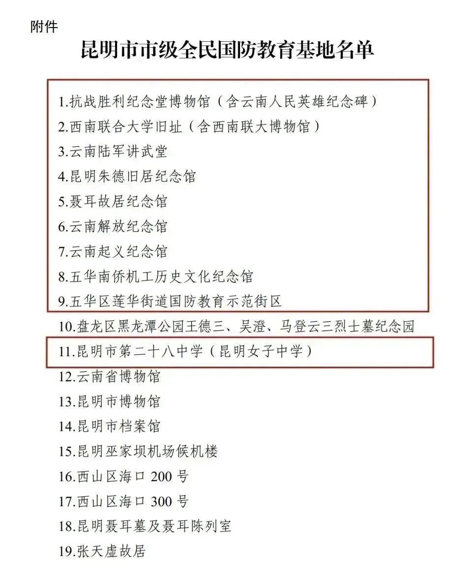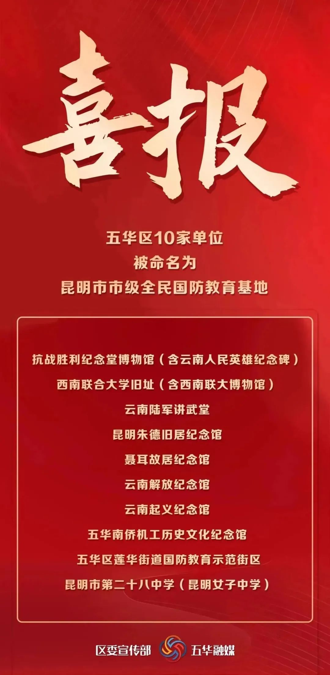 日前,经过实地测评和综合评审,市委宣传部命名宜良县全民国防教育基地等16家新申报基地、抗战胜利纪念堂博物馆(含云南人民英雄纪念碑)等29家通过复审基地为昆明市市级全民国防教育基地。其中,五华区10家单位被命名为昆明市市级全民国防教育基地。
