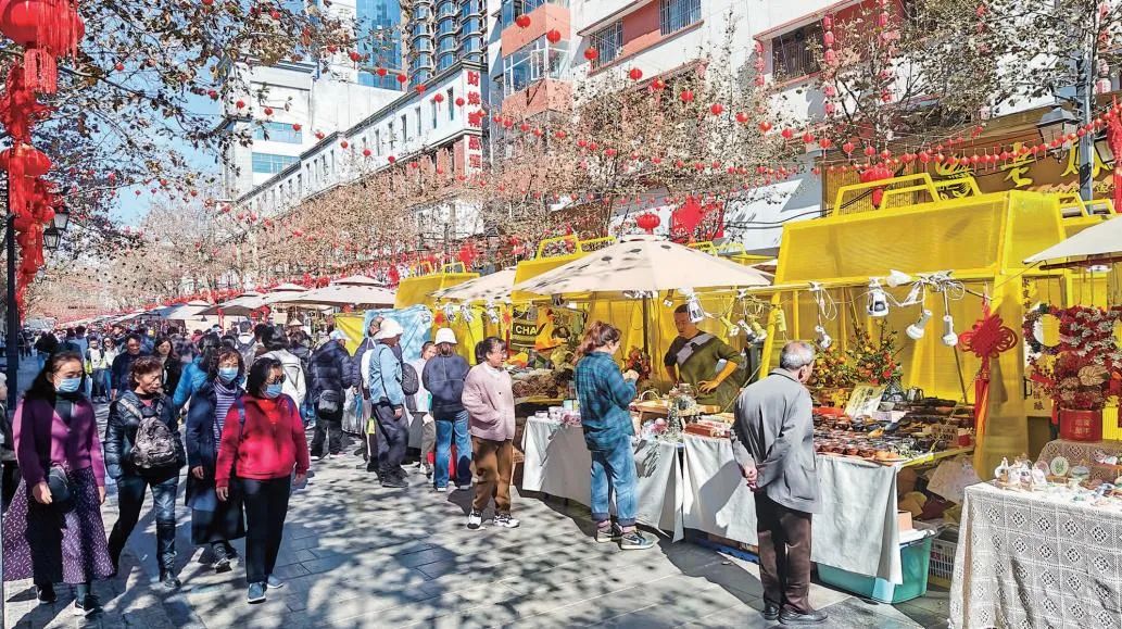 近日,翠湖新春集市正式“上线”。集市以中国红、金黄为主色调。市民游客们可购置精致的春联和龙年手工艺品,品尝甜美的蜂蜜、鲜嫩的火腿等,并带走一捧捧娇艳欲滴的“年花”,让龙年的吉祥瑞气更加鲜活。