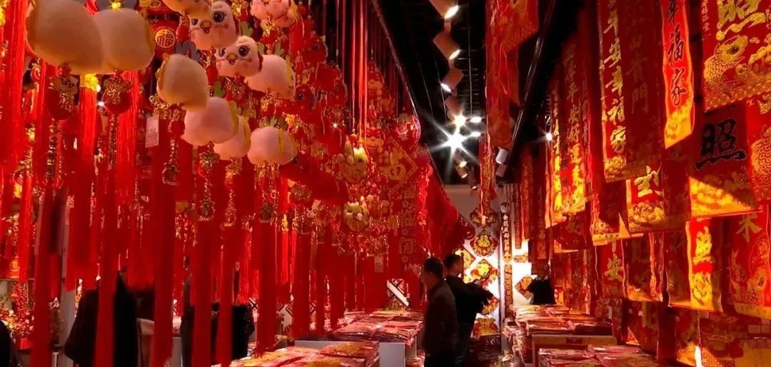 新春挂件、窗花、灯笼、对联……走进新螺蛳湾国际商贸城,喜庆的氛围扑面而来。对联、灯笼、"福"字、红包等,充满着祥和、欢乐的年味。今年,龙元素当仁不让成为年货市场的主角,以龙形象设计的饰品、摆件、挂件、红包款式多样。