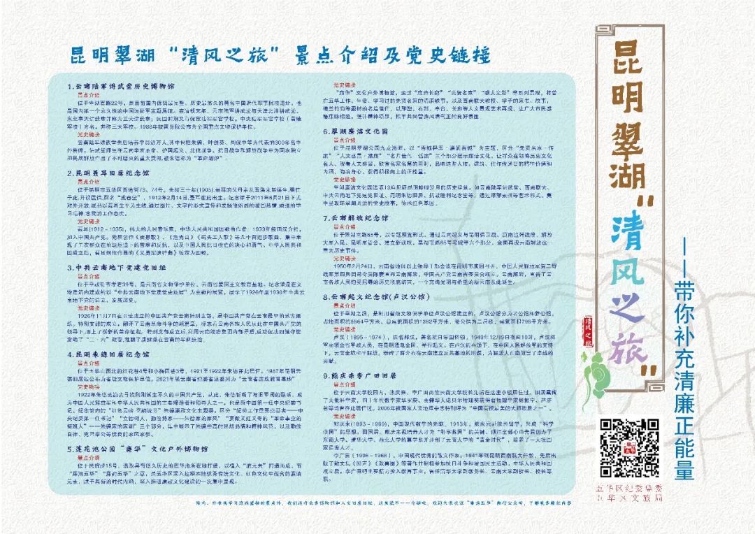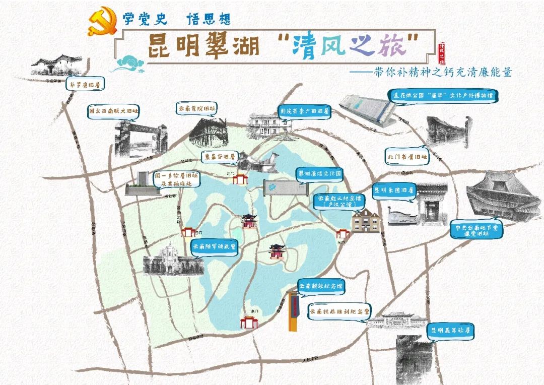 翠湖廉洁文化园选取13座见证昆明峥嵘岁月的历史建筑,如云南陆军讲武堂、西南联大、中共云南地下党建党旧址、昆明朱德旧居、抗战胜利纪念堂等,通过浮雕素描等艺术形式,集中呈现环翠湖周边的党史故事,传承红色基因。