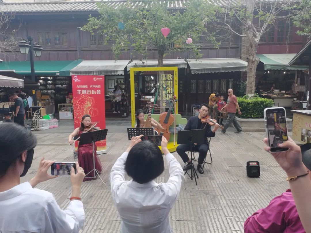 音乐会演奏了聂耳创作的脍炙人口的音乐作品和红色经典音乐作品。《卖报歌》是聂耳1933年创作的一首童谣歌曲,影响了一代代的中国人,时至今日仍然有很多小朋友喜欢。音乐会现场,演奏者用悠扬的琴声演奏了该曲,我们可能没有经历过解放前中国贫穷苦难的儿童生活,但从歌曲故事中可以体会到当时生活的不易。今天的幸福,应倍加珍惜!当《我和我的祖国》音乐响起,更是现场观众、游客一起激情歌唱,歌声中民族荣誉感和爱国情怀油然而生。