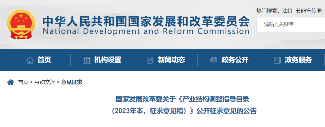 近日,国家发展改革委就《产业结构调整指导目录(2023年本,征求意见稿)》公开征求意见。